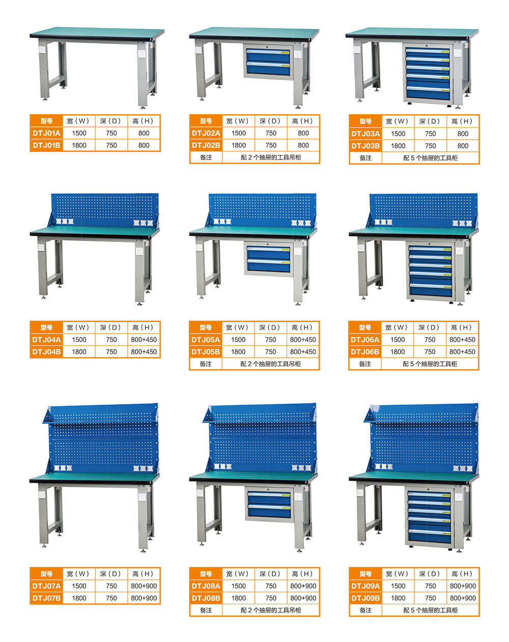 1.首先確認所需外觀。重型工作臺按外觀配置分為9種。?2.選擇所需桌面種類和桌面尺寸。默認桌面是50厚耐沖擊平面桌面。桌面長度有1800長和1500長2種。根據特殊需要可定做桌面表面1MM不銹鋼包邊包面或者鋼板鋪面桌面。桌面定制最大尺寸可做到長2400*寬1200MM。?3.工作臺采用組合式全拆裝結構,各部件可根據需要靈活變通組合搭配,1800長工作臺最多每臺可配置2個工具柜,既桌面下方左右各裝1個。?4.工作臺如果有頂棚板的款式可在頂棚板上裝燈。頂棚板安裝位置可調。燈架燈管,插座開關,客戶自備。工作臺桌面往上第1塊電源孔背板上有標配6個標準電源開關插座安裝孔位。?5.工作臺臺面以上背板上可以選配各種掛鉤掛件掛各種工具。工作臺價格不含掛鉤掛件。