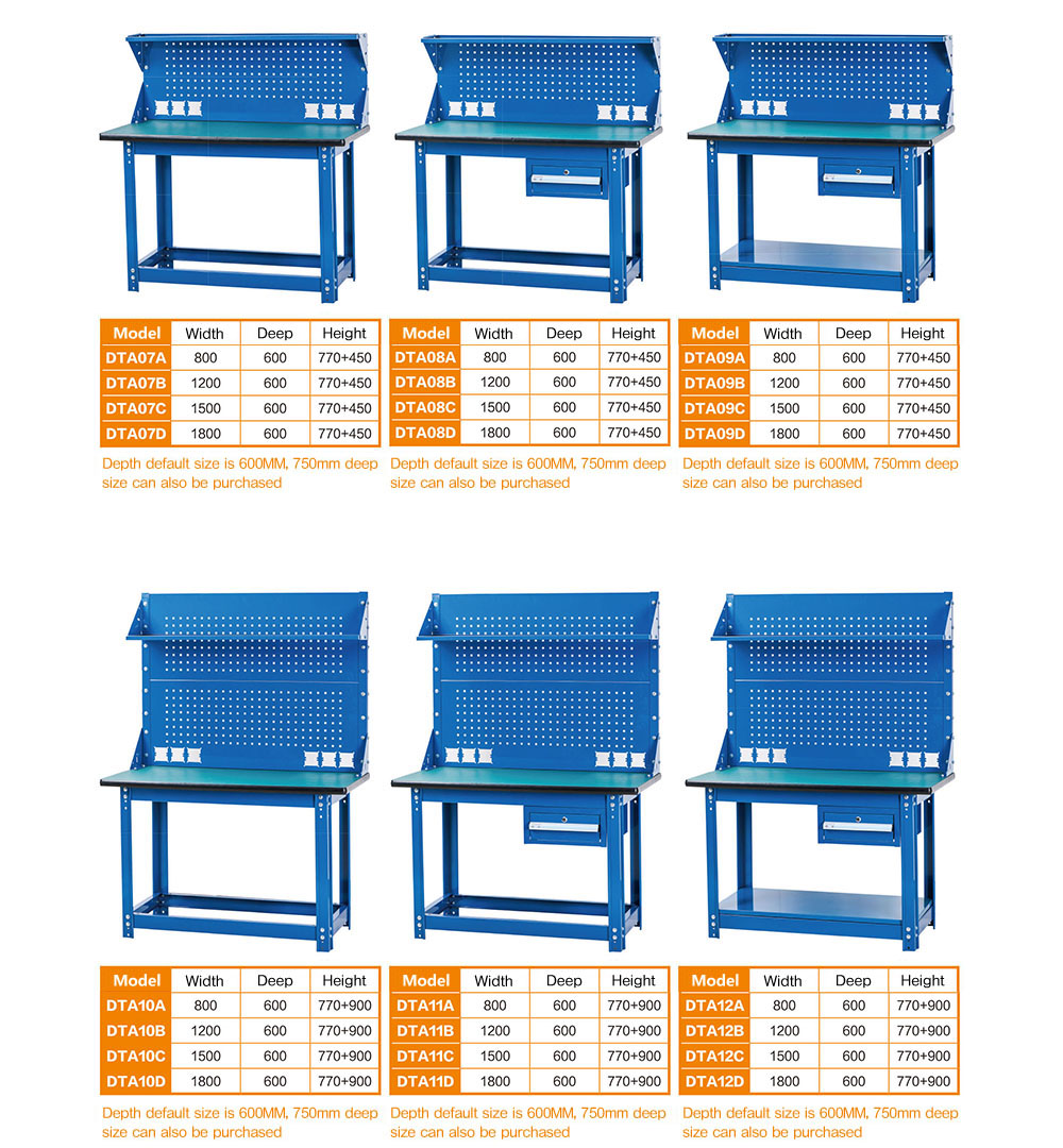 1.The DTA series workbenches are divided into 12 types according to the appearance configuration, DTA01 to DTA12. Delivery is based on the configuration of spare parts shipments, and additional configurations or drawers can be added as needed. In addition to the 800 wide worktables, up to 1200, 1500, 1800 long worktables can be configured with up to six drawers each, and there are three stacks on the left and right below the desktop, and three stacks on the right and below.